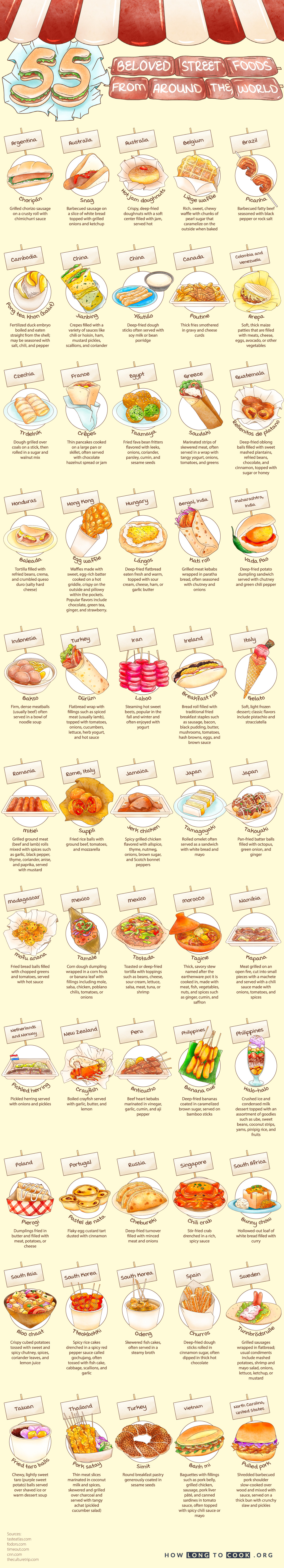 Street food is a dynamic, immersive way to experience the local cuisine of a country. Street food around the world is richly diverse but fueled by a universal desire: inexpensive, fulfilling fare that provides instant delight. Around the globe, you can discover quick, creative culinary creations that range from hearty fried fare to decadent desserts. To the Japanese, street food means fried octopus balls called takoyaki. Street food in Mexico includes fresh and savory tostadas and tamales, while in Spain, you can enjoy deep-fried dough sticks called churros. For those with a sweet tooth, Italian street food offers soft, creamy gelato. The team at How Long To Cook Calculator has created a visual guide to what street food looks like around the world to celebrate the delicious diversity offered by street vendors, food booths, and more: