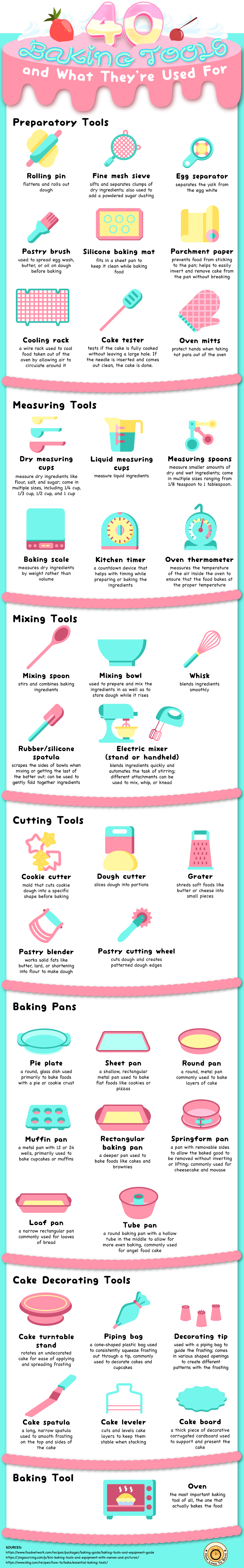 Baking can be a fun and rewarding hobby, but the number of baking tools out there can seem daunting to any beginner. To make it easier for a novice who is baking at home, the team at How Long To Cook put together a list of the 40 baking tools that we believe are the most beneficial to have on hand when it comes to baking all of those sweets and treats you crave. This colorful visual includes the tool names with images to help you identify each one as well as a brief description of how each piece of baking equipment is meant to be used. We hope this list of baking tools and equipment inspires you to get in the kitchen and try your hand at baking something delicious!