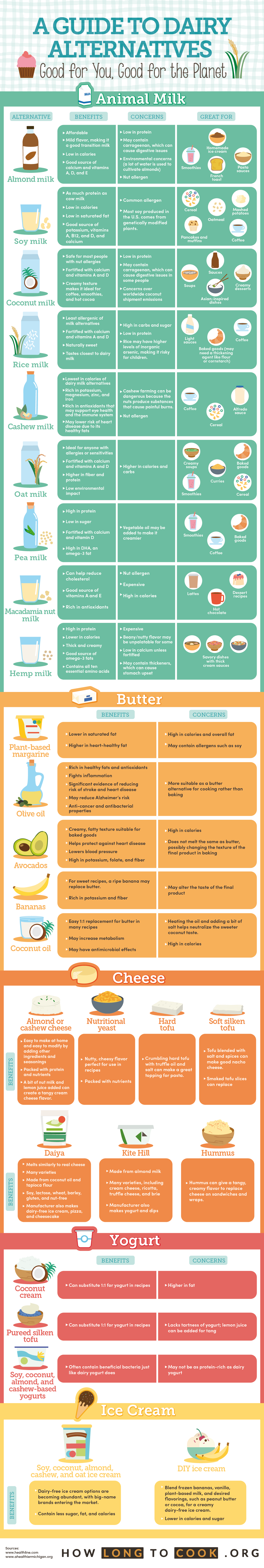 Soy milk | As much protein as cow milk Low in calories Low in saturated fat Good source of potassium, vitamins A, B12, and D, and calcium | Common allergen Most soy produced in the U.S. comes from genetically modified plants. | Coffee Cereal Oatmeal Breakfast baked goods like pancakes and muffins Mashed potatoes |