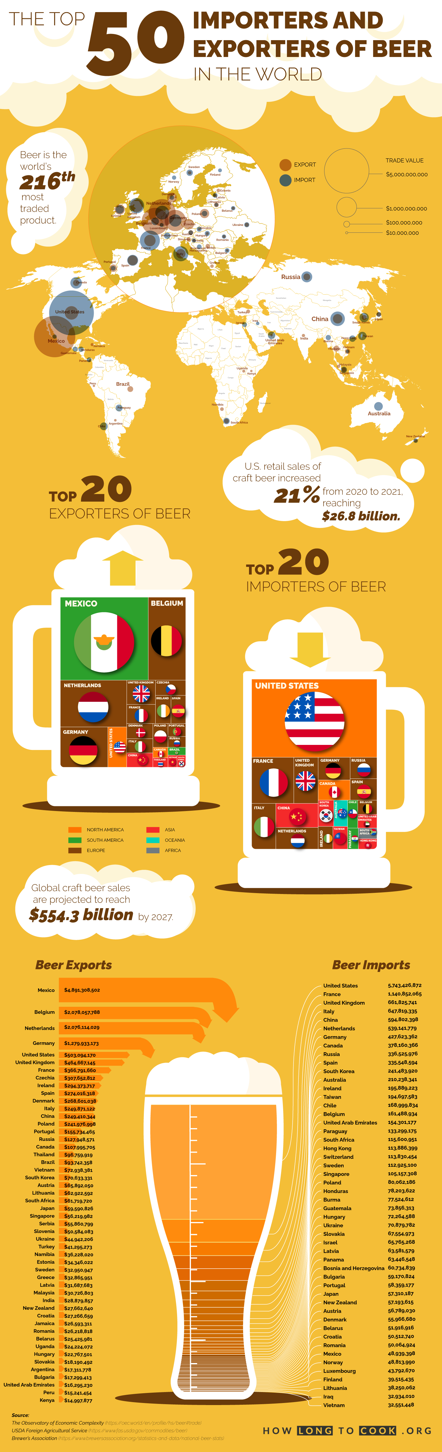 Beer is the most popular alcoholic beverage in the world. In fact, after water and tea, beer is the most commonly consumed drink around the globe. How big is the beer industry? The global beer market was valued at $680.9 billion in 2021 with a projected growth of 7% from 2022 to 2030, according to Grand View Research. Where does all that beer come from, and where does it go? The team at How Long to Cook analyzed worldwide beer import and export data to showcase the top players in the world of beer. You will discover how much beer is imported to the U.S., what country exports the most beer, and much more!