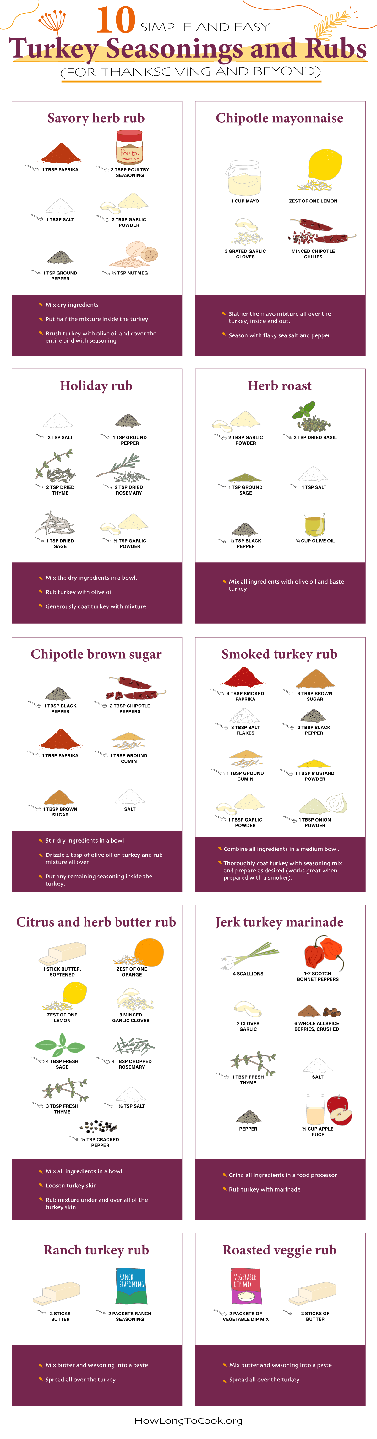 You can add seasoning to a turkey the night before the big day or as far in advance as a couple of days. You can dry brine your turkey for maximum flavor, juiciness, and crispiness. What is a dry brine, and how do you dry brine? A dry brine is also called pre-salting — it involves rubbing salt and seasonings directly onto the meat and skin and letting it rest in the fridge for some time. Many of the Thanksgiving seasoning mixes featured on the infographic would work wonderfully as a delectable dry brine.